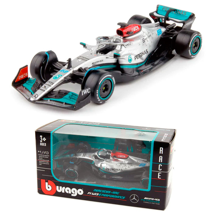 Great value, 1/43 scale die-cast model of the #63 Mercedes-AMG W13 Formula 1 car as driven by George Russell during the 2022 season. This Mercedes-AMG W13 #63 measures approx 13cm in length. Made by Bburago. Die-cast metal with plastic parts.